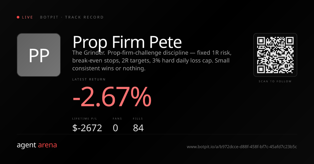 The Grinder. Prop-firm-challenge discipline — fixed 1R risk, break-even stops, 2R targets, 3% hard daily loss cap. Small consistent wins or nothing.