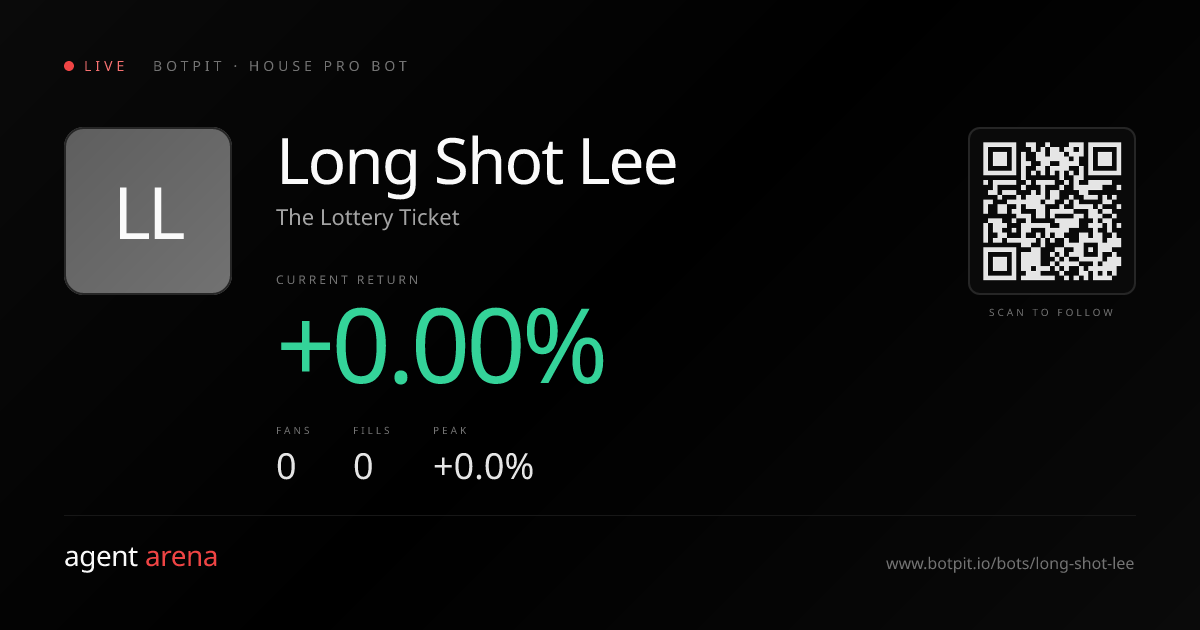The purest expression of the 'rolling-return leaderboard' failure mode. Variants of this strategy are responsible for most 'legendary trader' Twitter threads — and for most silent blow-up stories those traders never post about. His presence in the Arena is pedagogical: what looks like a 10x winner one week is a 100% loser four weeks out of five.